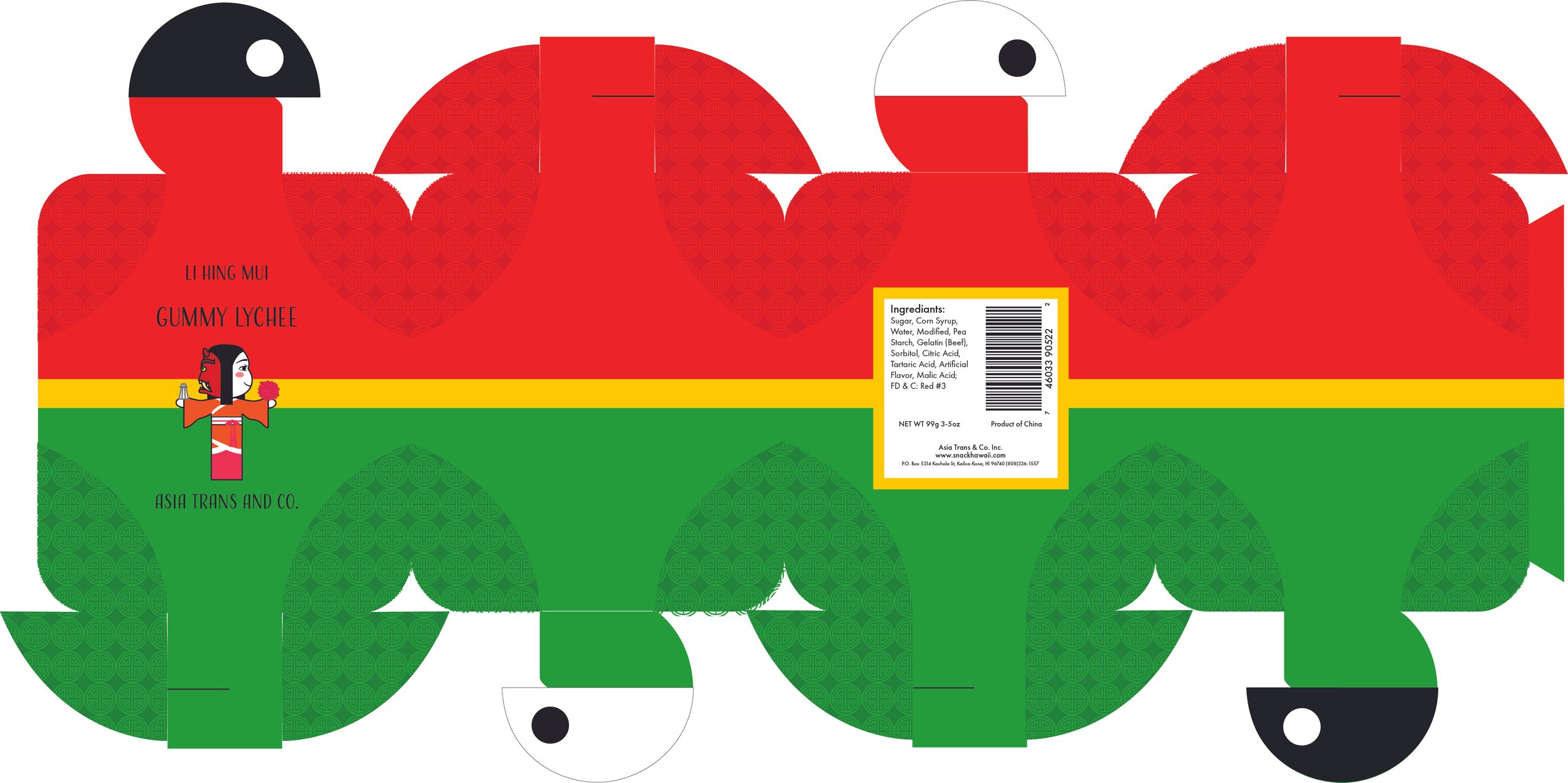 This was a project in packaging class where we had to make a box with a unique shape. I had the choice to make up a product, but I found it more challenging to use it for an existing product. Li Hing Mui is a company that mass produces Asian sweets to Asian and Pacific Islander candy shops. Although the company did not sell their products in their own stores at the time, I tried to make the design based on if they opened their own shop.